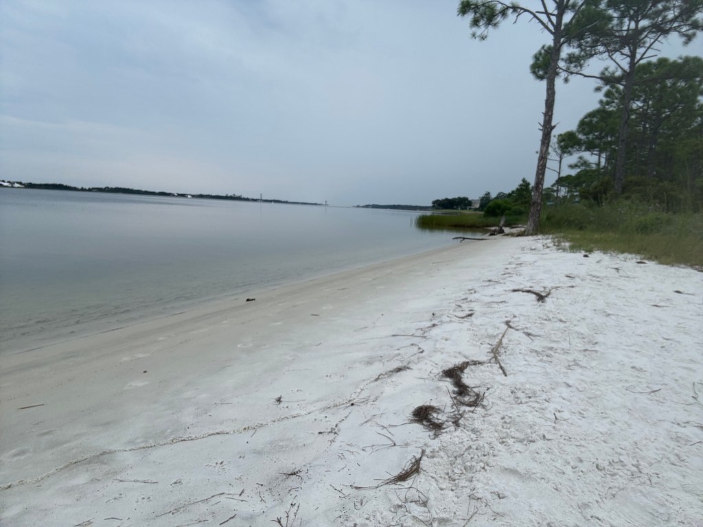 My slippered feet passed over the black asphalt, still cool from a night’s respite from the sun. I exited the parking lot, stepping into cool, soft white sand riddled with specks of grass and plants. Immediately my slippers came off my feet and I carried them lazily along the briefly winding sandy path. I love how different it is to walk on sand than on hard earth or asphalt. The shift beneath my hips, prompting an extra engagement for all of my muscles and joints. As I walked by a pier, my eyes constantly glanced from ocean horizon to the ground by my feet so as to avoid any surprise fish hook or other sharp object ending my lovely morning.