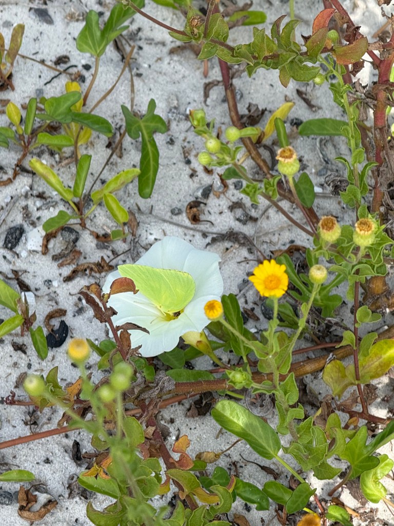 I began putting on my sunscreen, a small step to allow myself time to still drive away without commitment but also preparing to walk out there if I should so choose. A fisherman walked by, rolling his gear in a wagon. Deliverymen opened the heavy metal door of their trailer and began unloading goods for the stores. Then an older couple strolled by, hand in hand, pleasantly chatting on their way to enjoy a beach walk. “Okay,” I thought, “these are people like me. I am ready to discover what is on the beach this morning.